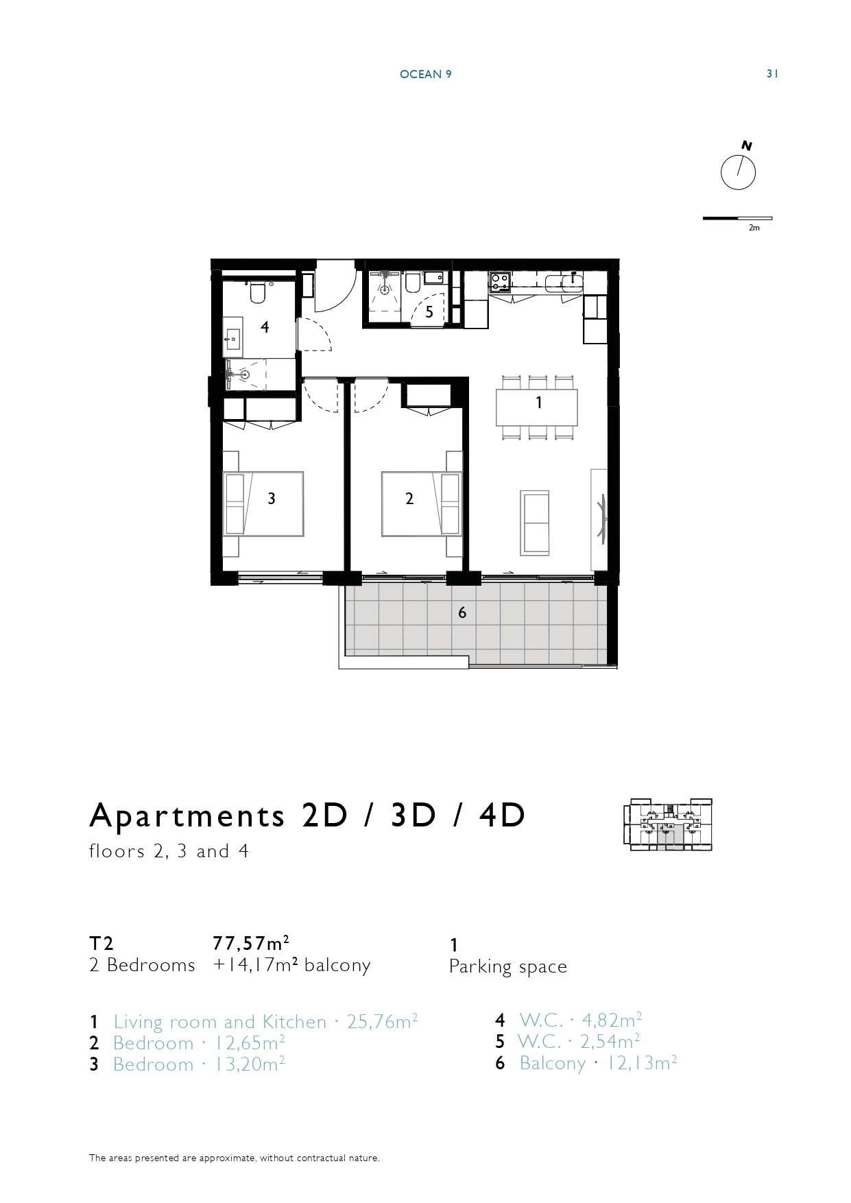 | 3D | 3 | 2 bedrooms | 77,60m2 + 14,20m2 balcony | 1 | Available | View Floor Plan